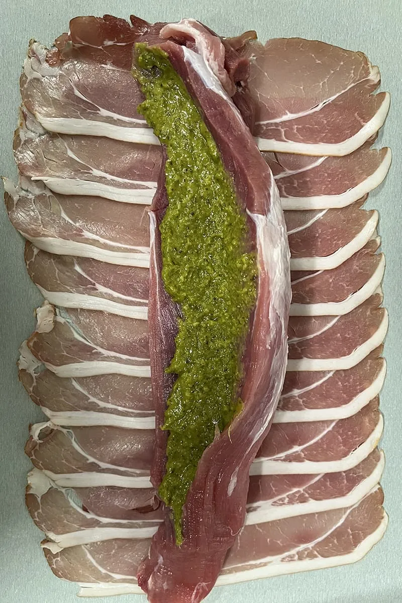 Besmeer de binnenkant met een laagje pesto en vouw de ham over de varkenshaas heen.