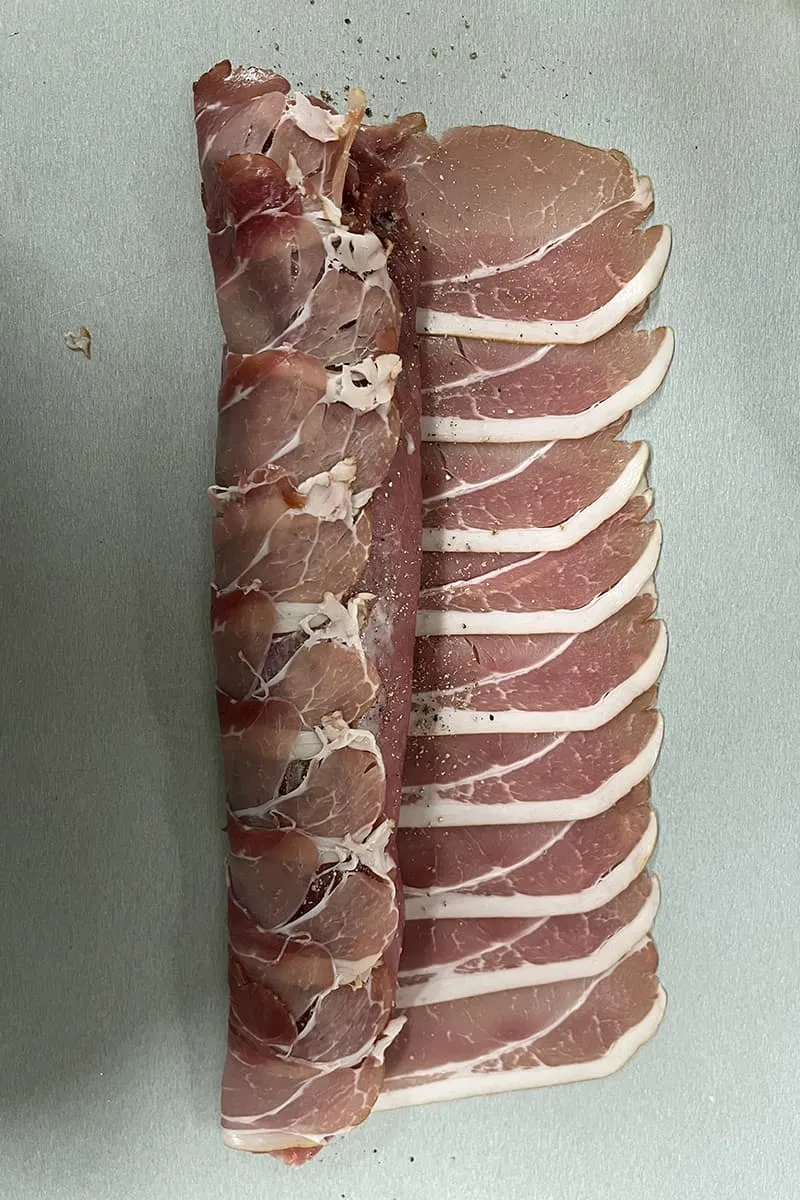 Leg 9 plakken rauwe ham dakpansgewijs op het aanrecht (of snijplank) en leg hier de varkenshaas op.